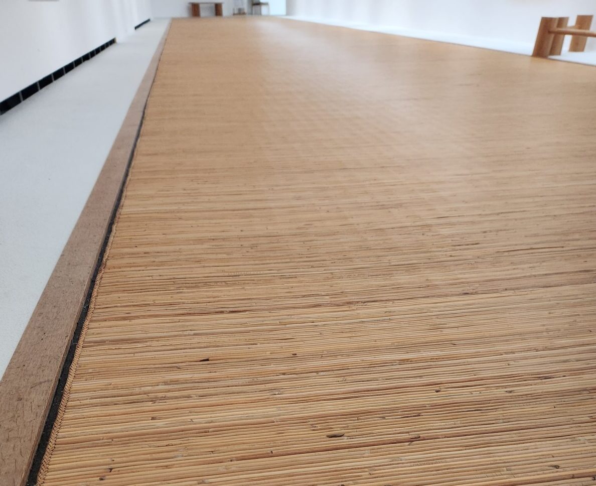 The first exhibition room is shaped like a long rectangular corridor, featuring white plaster walls and floors covered with rattan mats.