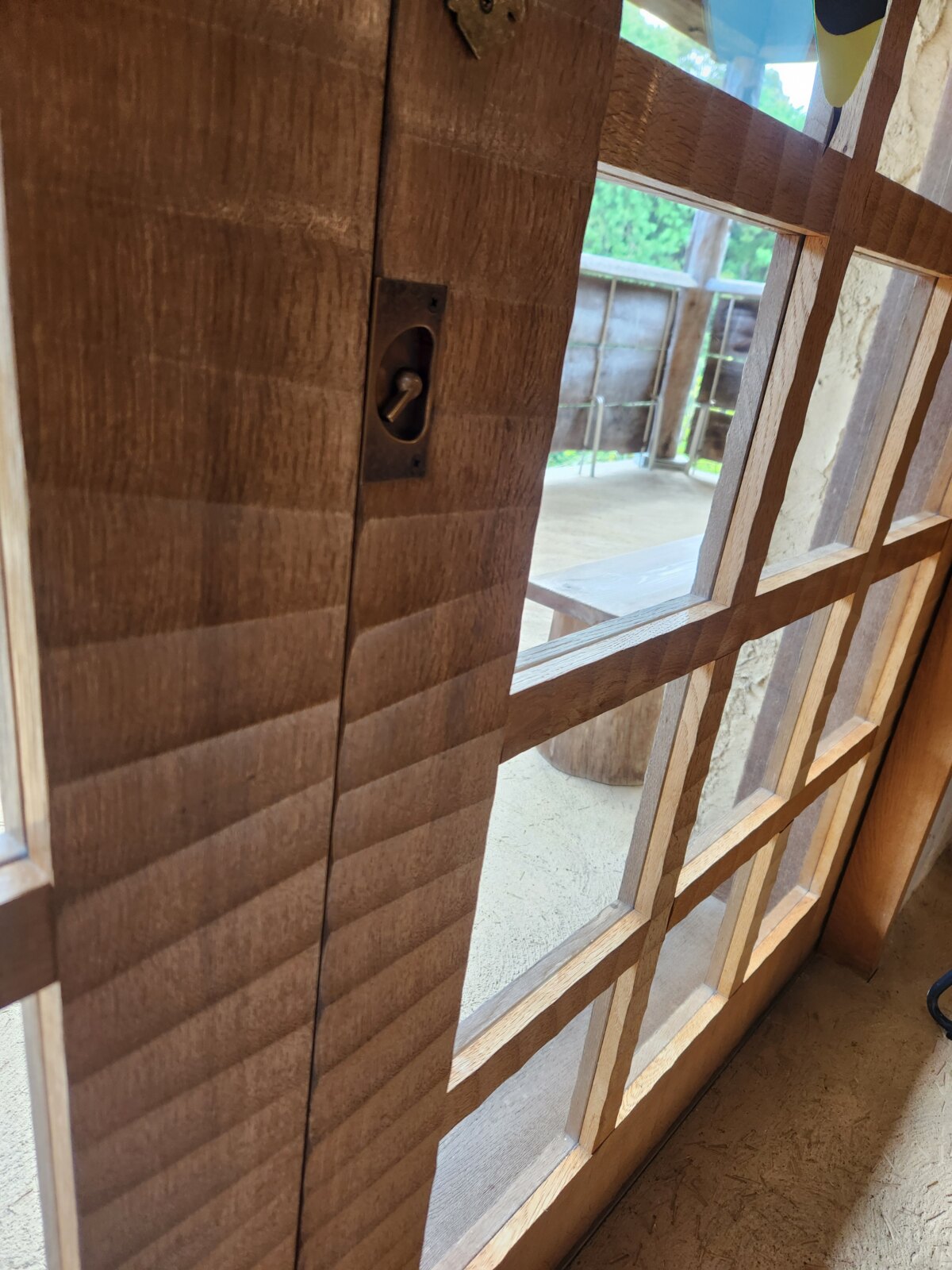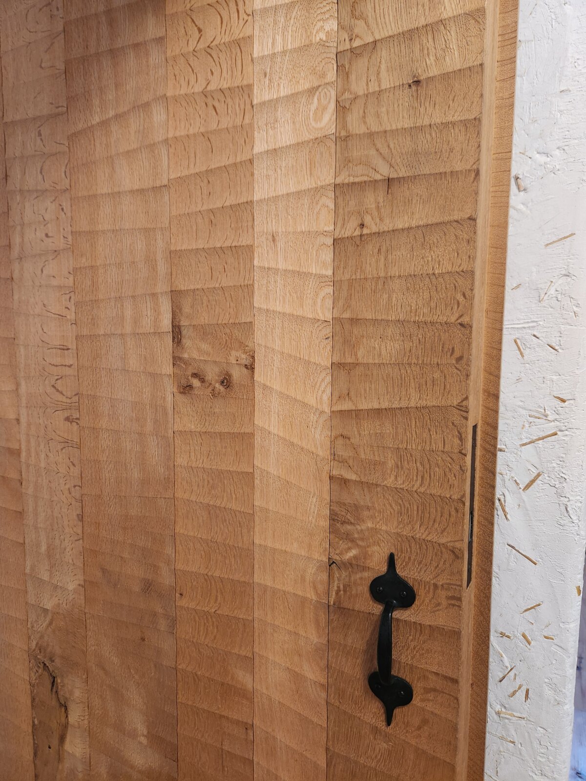 The doors and window frames feature a unique texture created with a curved plane, resulting in a one-of-a-kind design that makes you want to reach out and feel it for yourself.