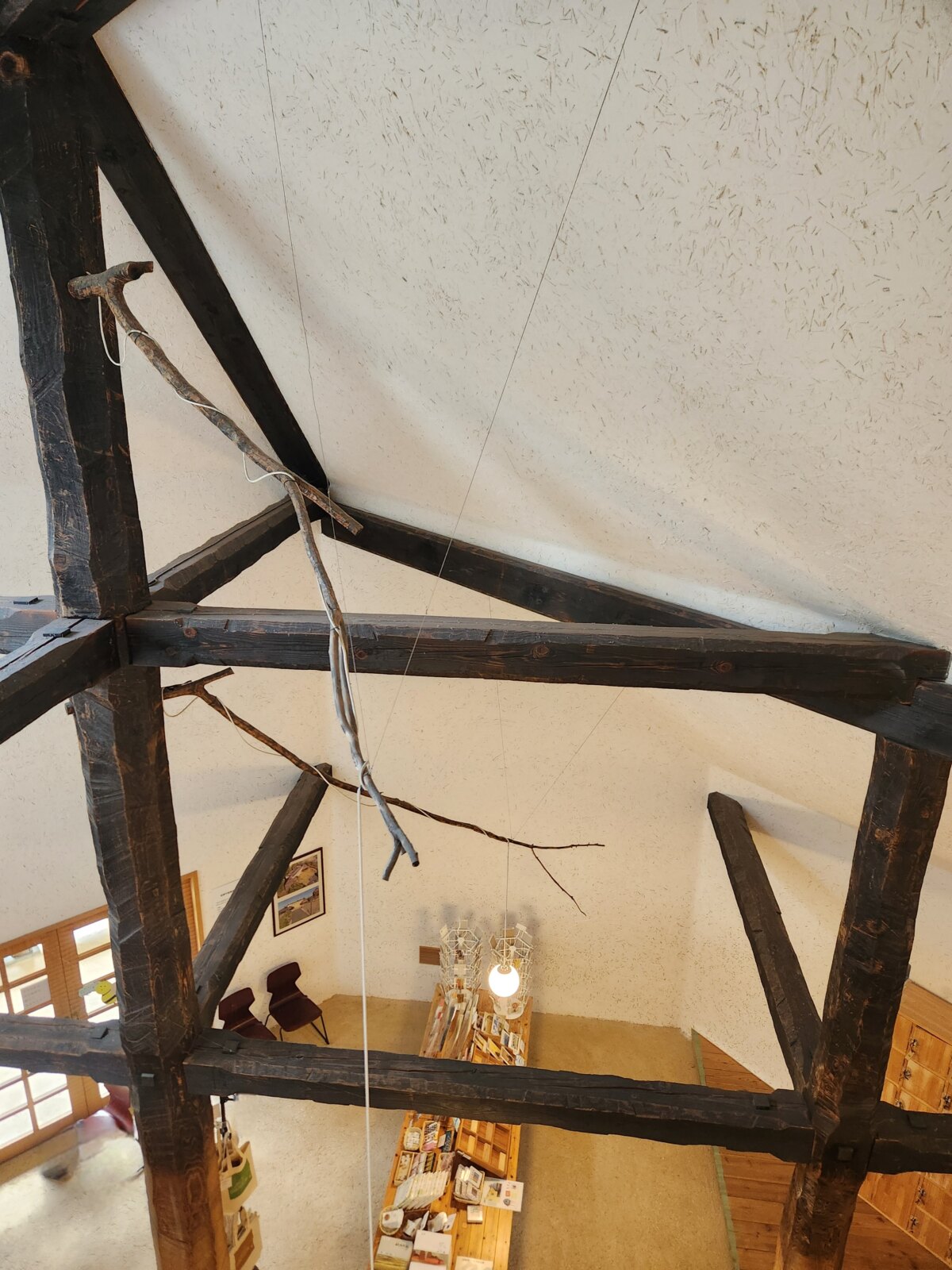 The exposed ceiling beams evoke the same tone as the black used in Akino Fuku’s artworks, creating a sense of harmony with the building.