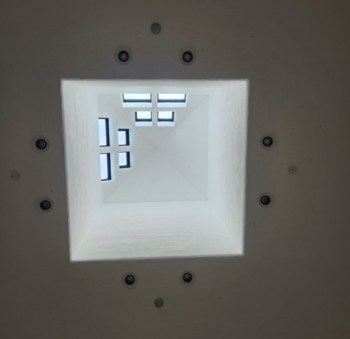 When you look up from the center of the exhibition room, you’ll notice that windows are placed only on the north and west sides.