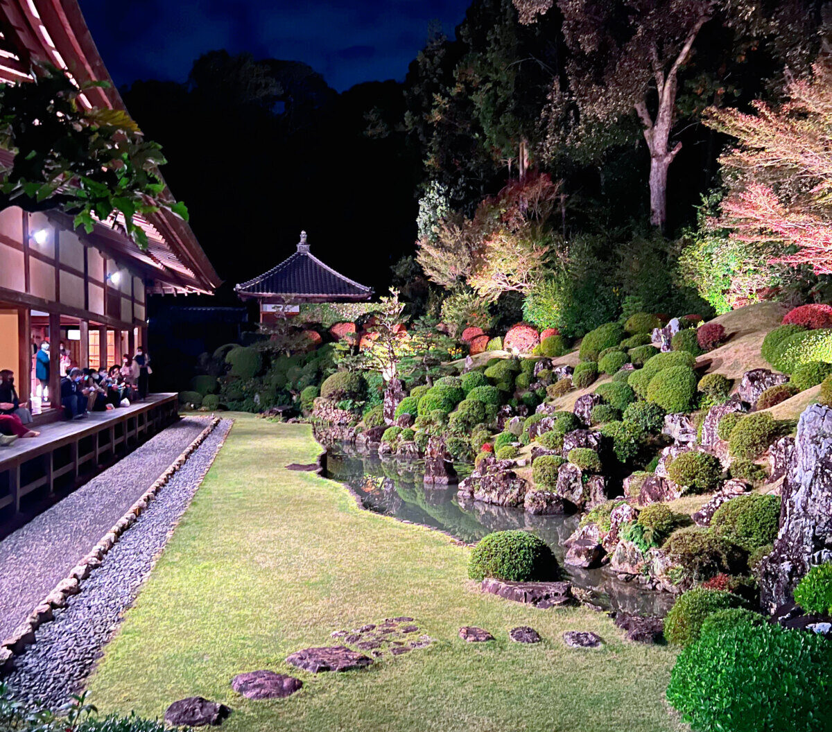 The temple holds a special night viewing in autumn, featuring illuminated autumn leaves and the Important Cultural Property, the Shaka Triad Statue.