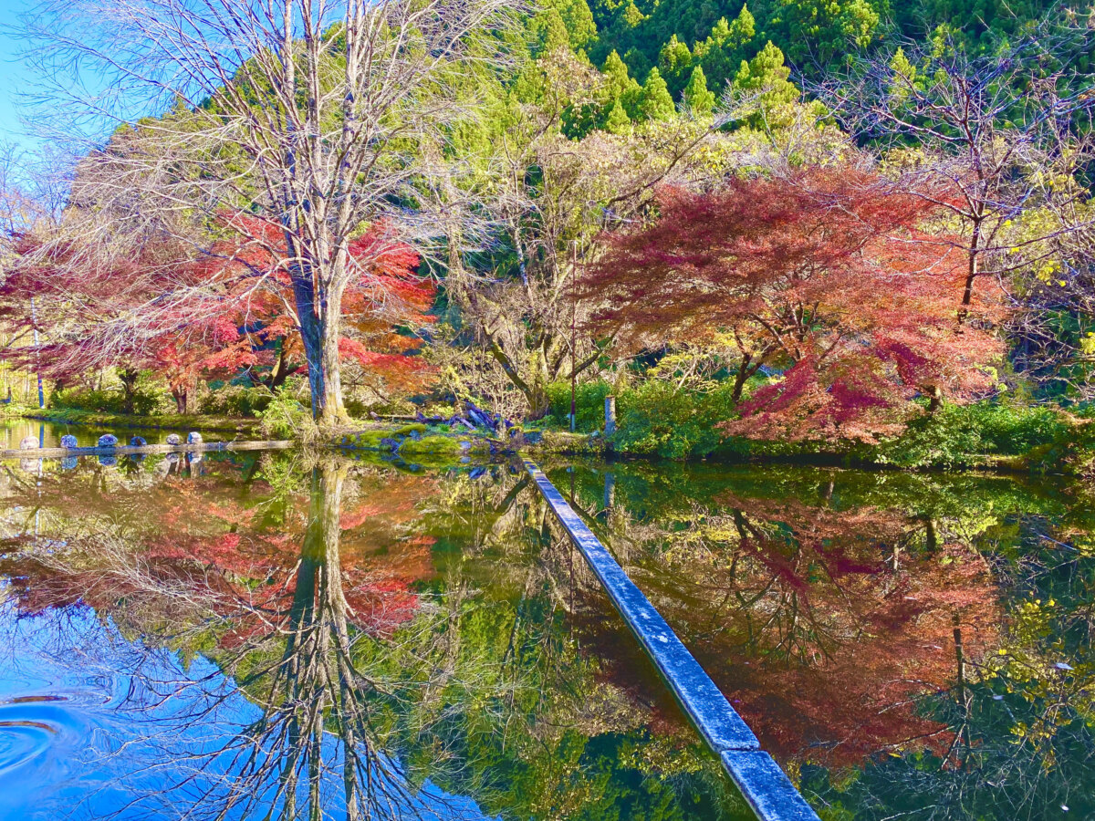 Around Seseragi Pond, located next to the parking lot, the red and yellow autumn leaves are reflected on the water, creating a seasonal view that can only be seen at this time of year.