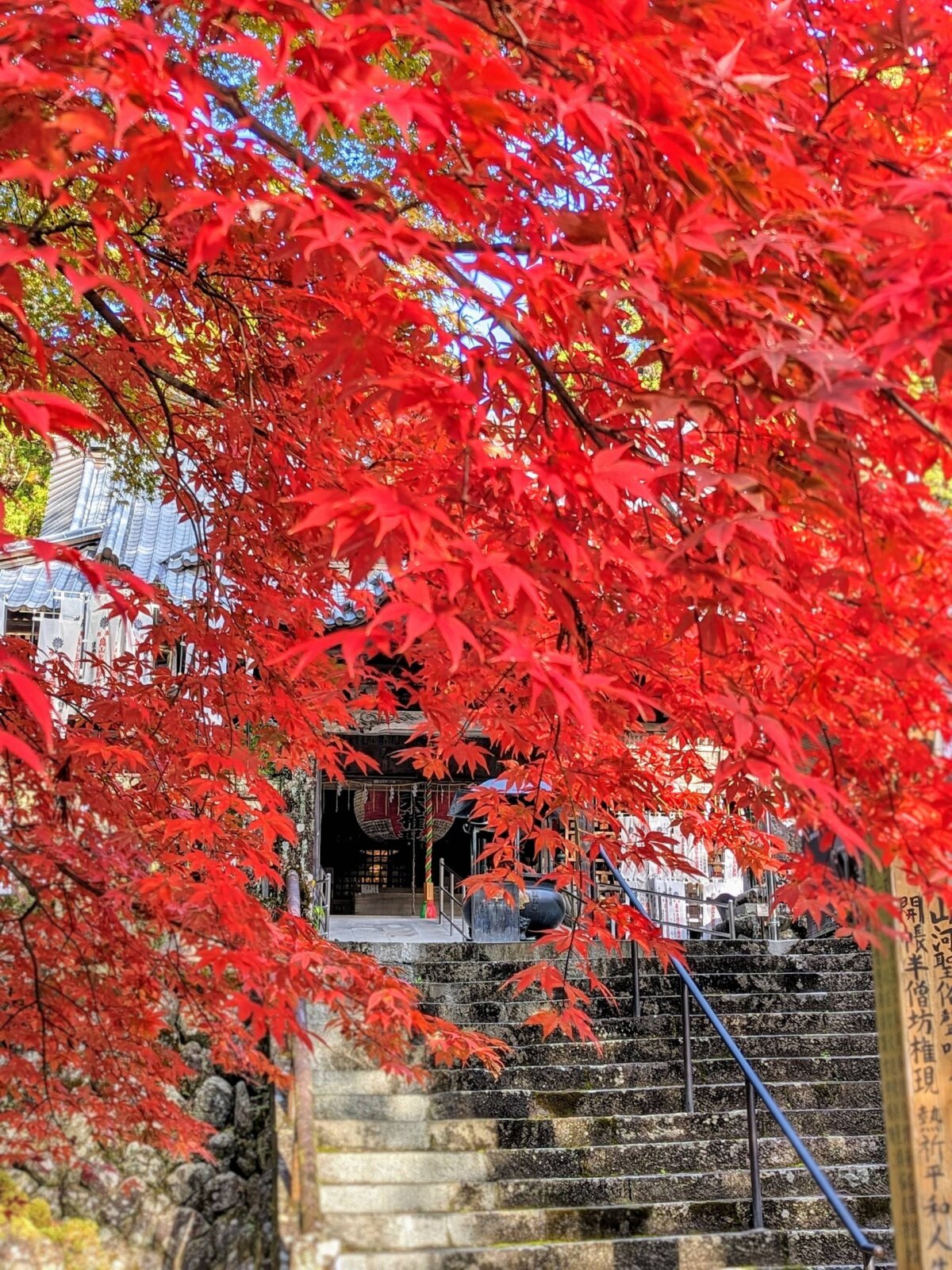 During the autumn foliage season, the maple trees on the temple grounds turn bright red, creating a stunning display of autumn colors.