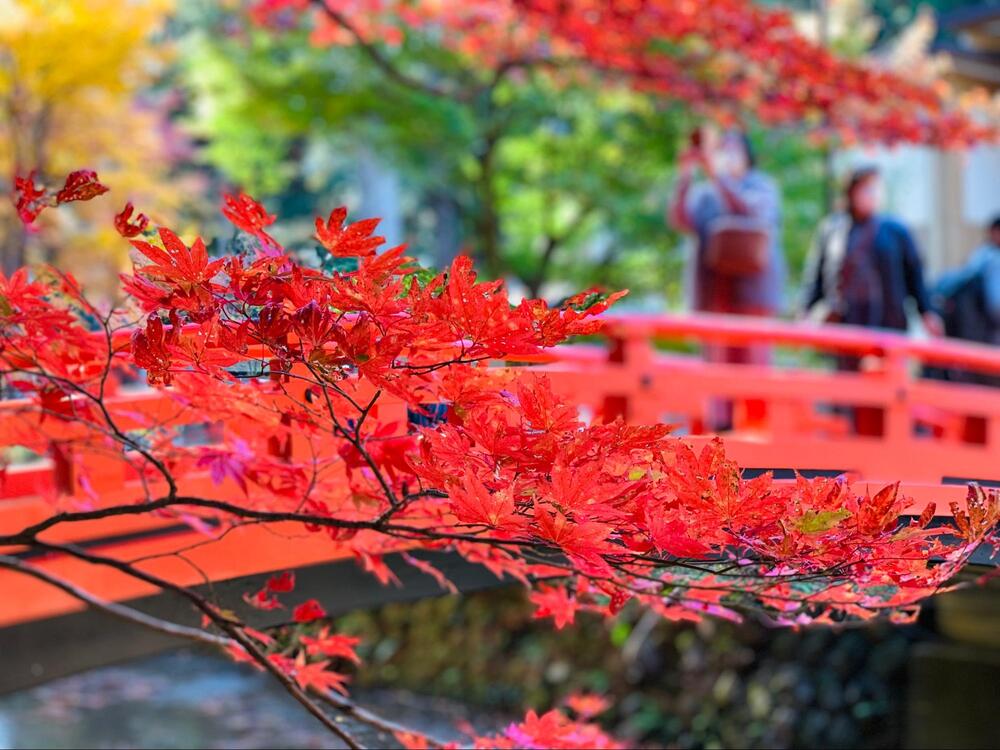 A recommended spot is the Kihai Bridge, a red bridge that offers a scenic view of Hoko-ji Temple surrounded by autumn foliage.
