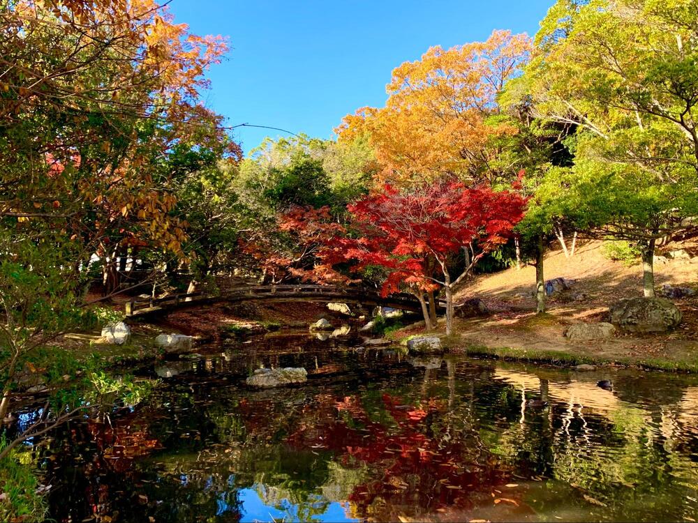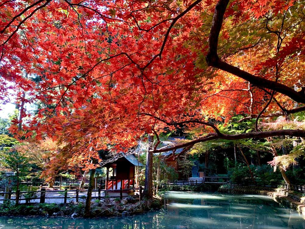 The deep blue-green water of Kotomachi Pond contrasts beautifully with the red maple leaves, offering a scenic view that makes you want to linger.