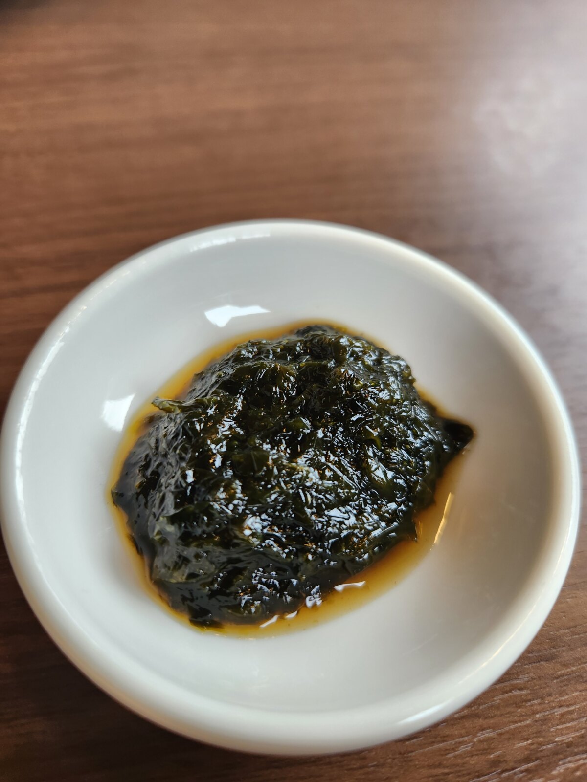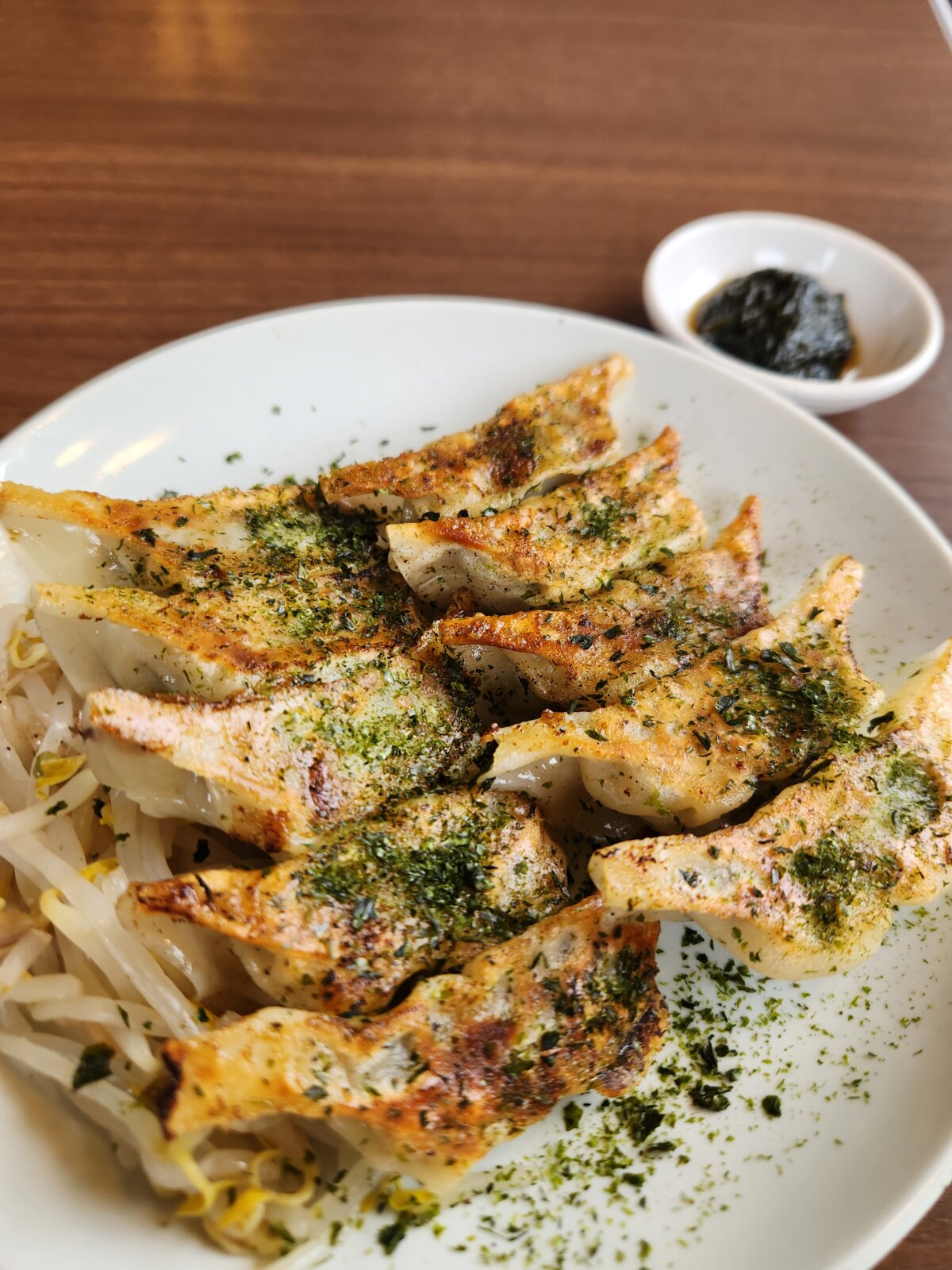 The dipping sauce is a surprising nori seaweed paste (nori tsukudani), which goes perfectly with the gyoza.