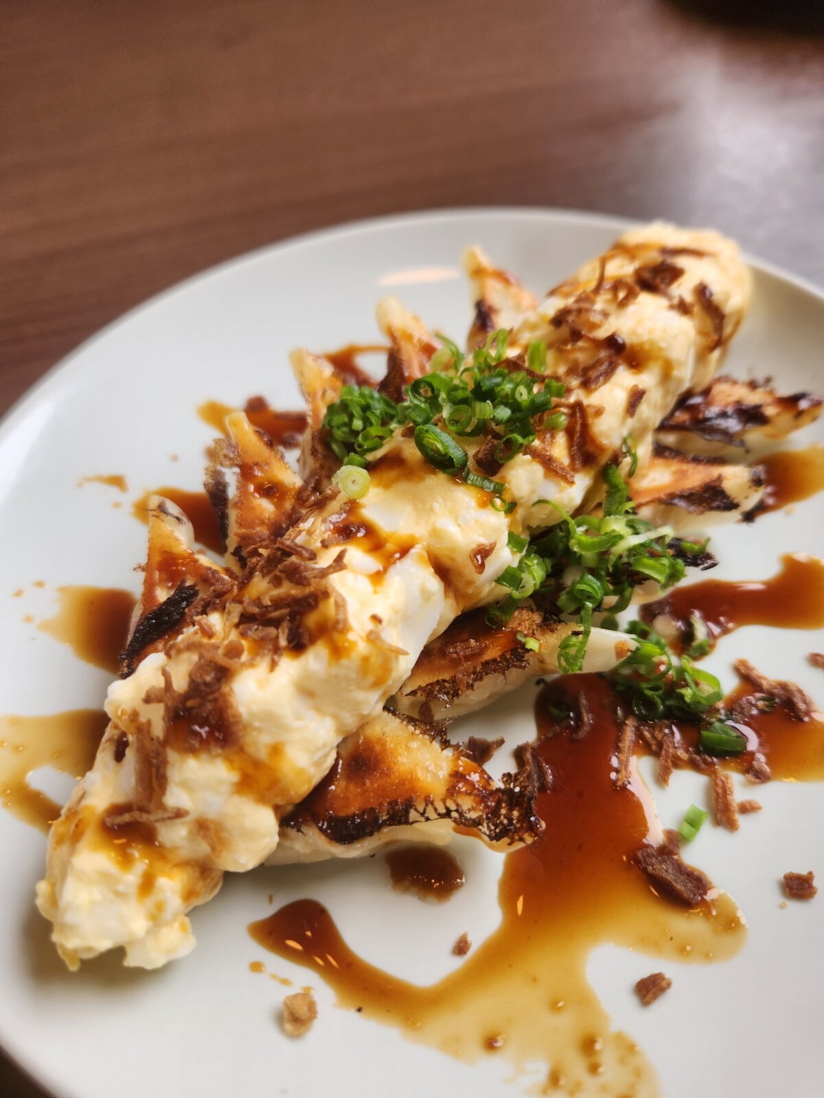 These gyoza are topped with a special egg salad, teriyaki sauce, and crispy onion chips!