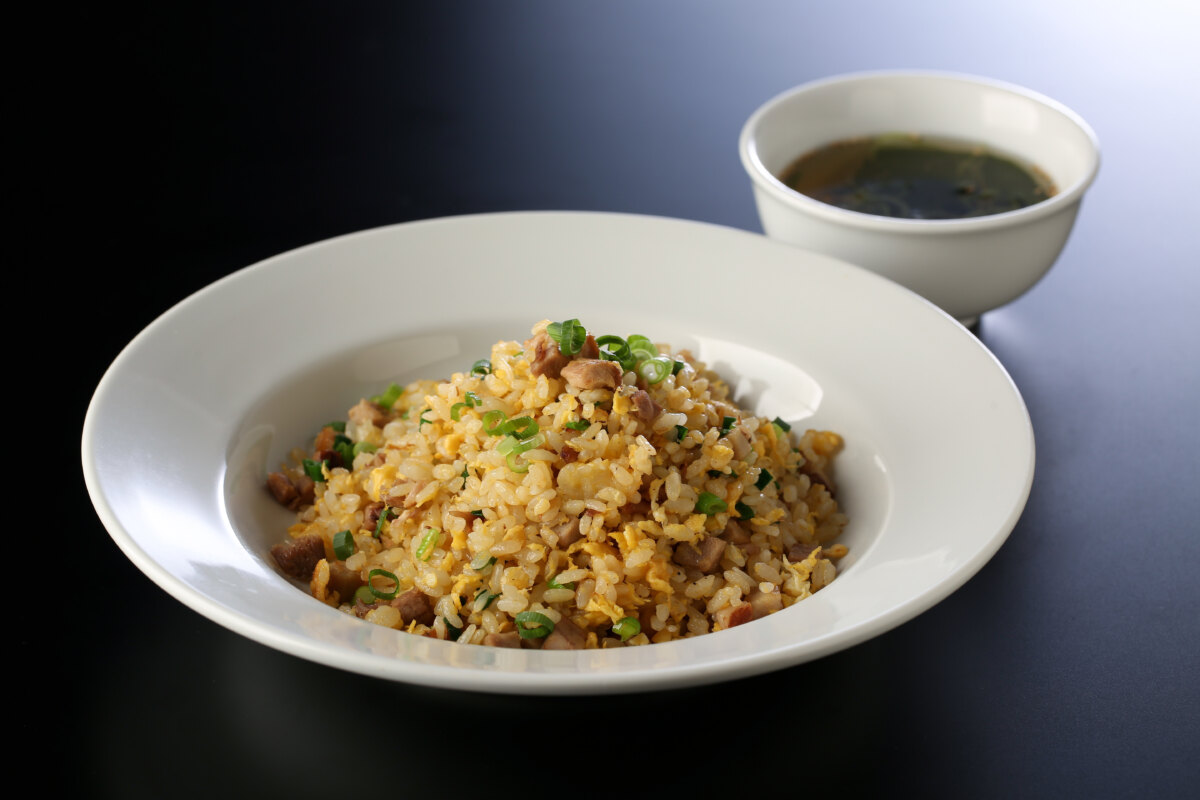 The fluffy, moist fried rice is made with a special sauce and comes with a side of soup.