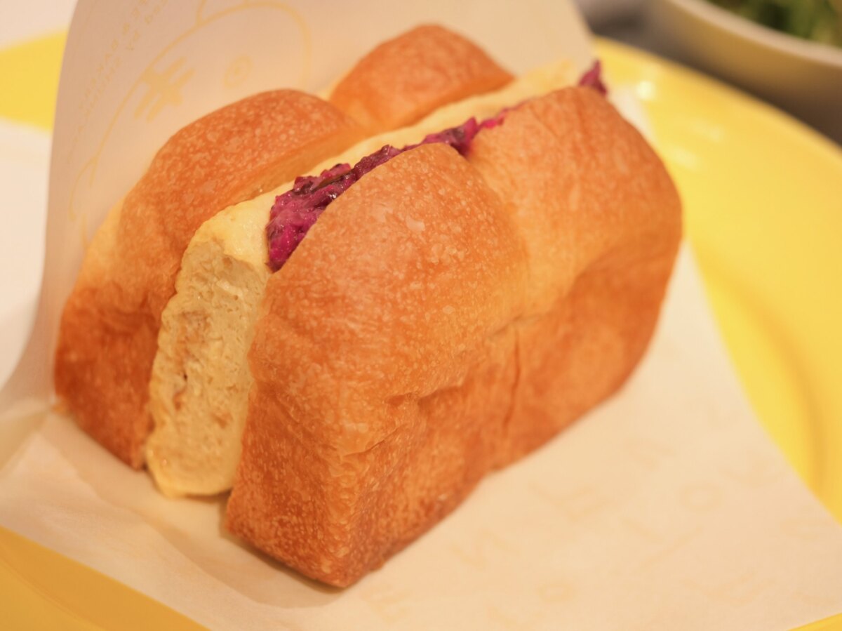 부드러운 브리오슈 사이에 끼워진 것은, 탱글탱글한 계란말이입니다.