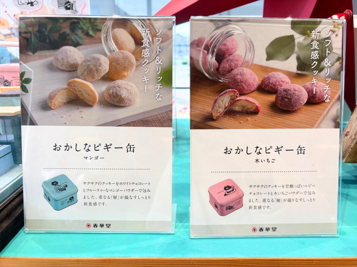 SHOP 슈카도에서는 피기를 모델로 한 조상과자(上生菓子)와 한정 쿠키 ‘오카시나 피기 캔(おかしなピギー缶)’도 판매하고 있습니다.