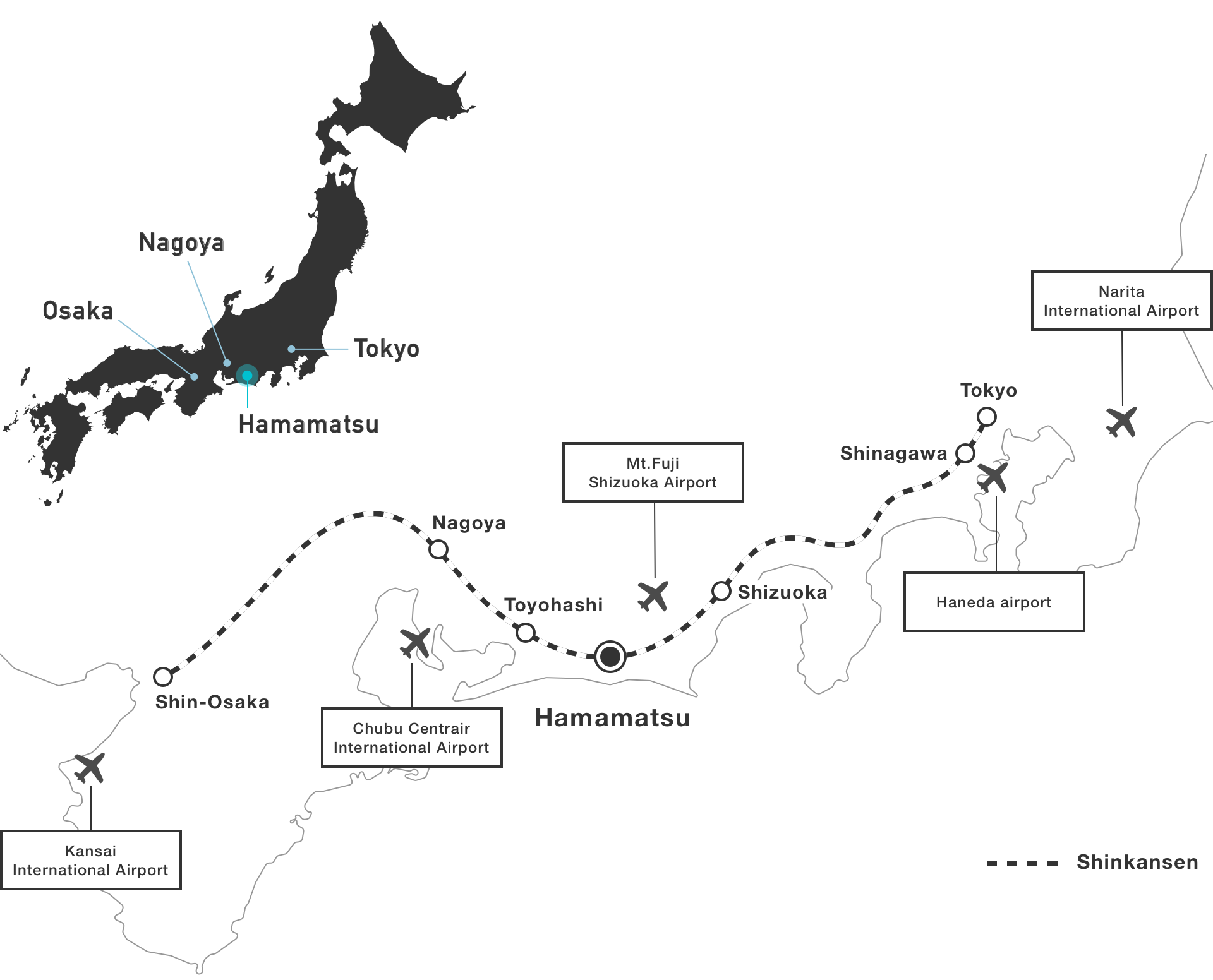 Hamamatsu is just 90 minutes from Tokyo and Osaka by Shinkansen. This major stop on the Tokaido Shinkansen line, is located in the heart of Japan's Golden Route. Enjoy a seamless train ride whether you're coming from Narita, Haneda, or Kansai International Airport.