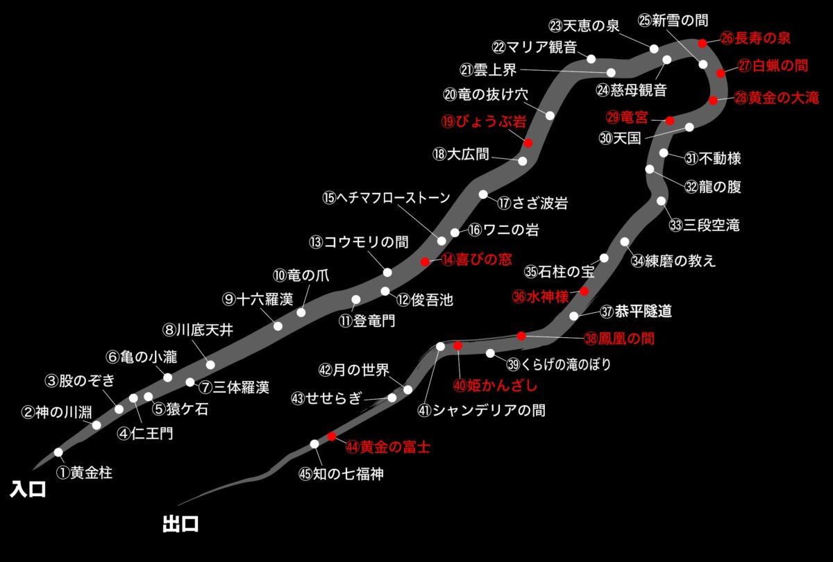 經過2億5千萬年形成的鐘乳石美麗壯觀,洞內有「マリア(Maria)觀音」、「鳳凰之間」、「石柱寶藏」等鐘乳石,能欣賞到大自然造就的奇妙造型美。