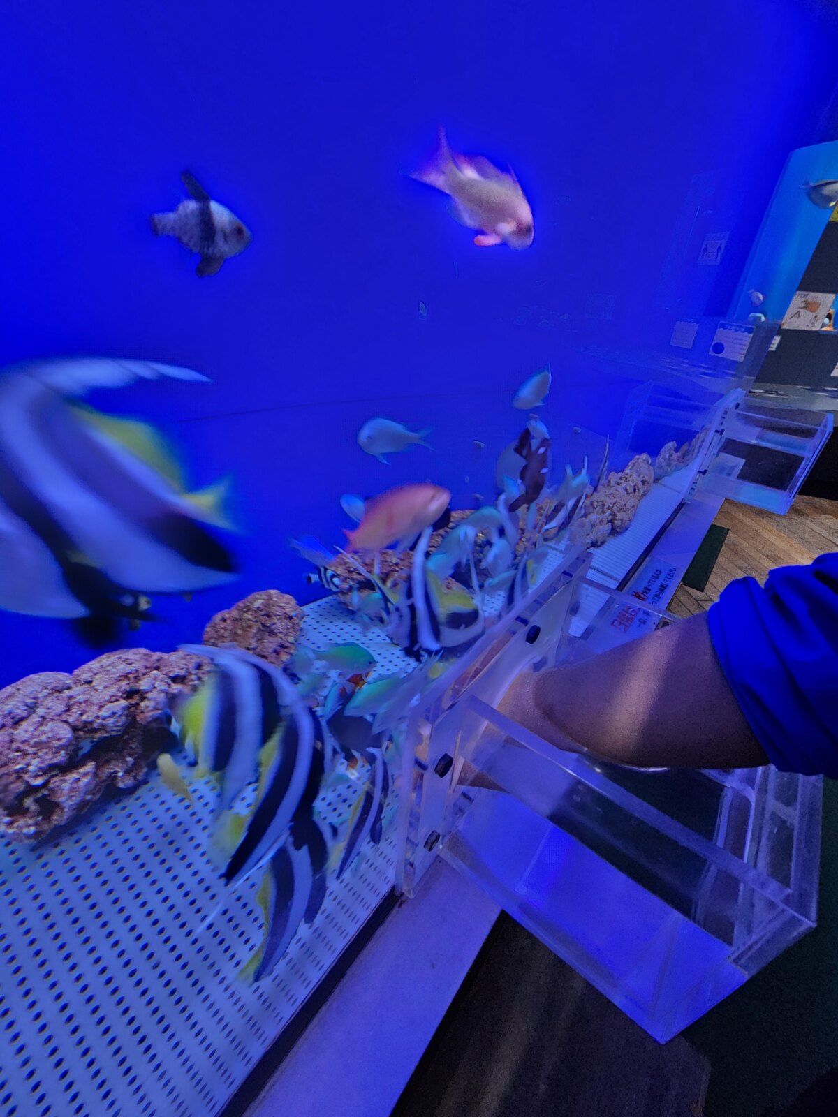 在互動體驗水槽中,可以把手伸進熱帶魚悠游的水槽裡,親手觸摸魚兒。